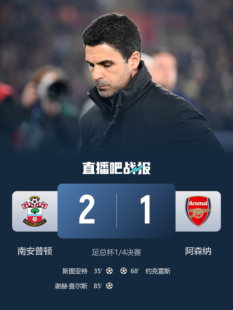 爆冷!阿森纳1-2圣徒止步足总杯八强 约克雷斯破门难救主加布伤退