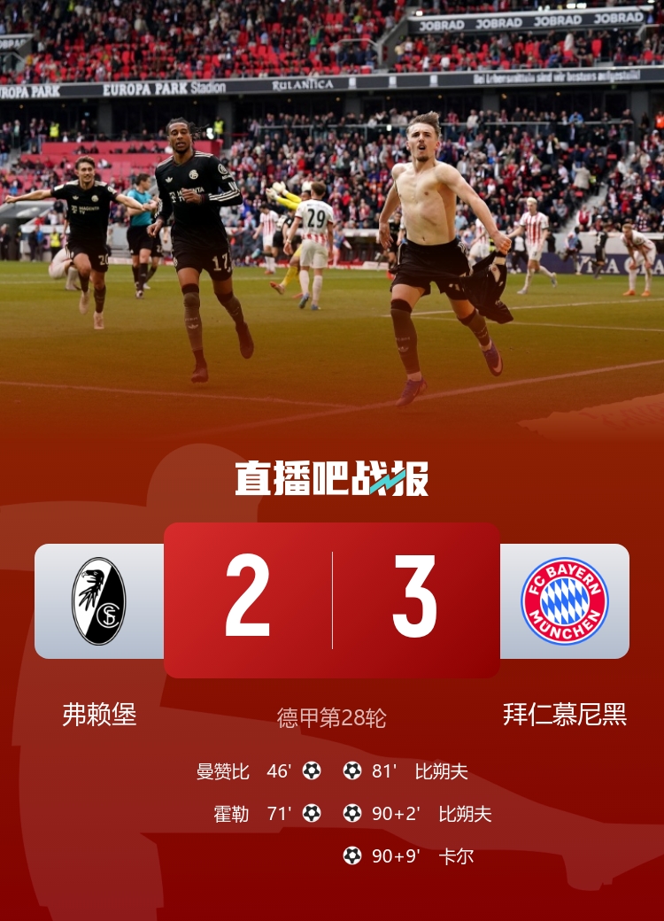 让二追三!拜仁3-2逆转弗赖堡先赛12分领跑 比朔夫双响卡尔绝杀